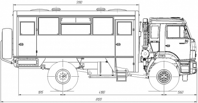 Кузов Закрытый фургонного каркасного типа с термоизоляцией. Две двери в правой боковине, одна из них аварийная. Запасное колесо на задней стенке с внешней стороны.